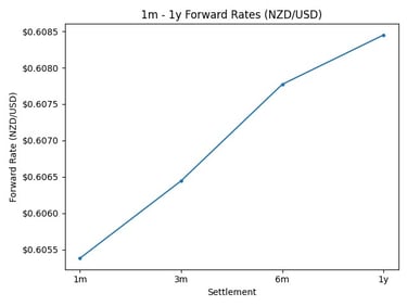 I explored the Interest Rate Parity (IRP) through a practical, automated example. Using Python, I collected interest rate data from FRED and RBNZ (B2) series, covering maturities of 1 month, 3 months, 6 months, and 1 year, alongside the current spot FX rate. I then applied IRP to calculate forward exchange rates based on the interest rate differential between New Zealand and the U.S.