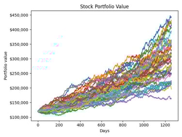 Simulated 50 paths in Python over a 5-year horizon for a diversified investment portfolio using historical returns and covariance data from Yahoo Finance. Applied Cholesky decomposition to incorporate inter-asset correlations between NZX50, S&P 500, and VT future returns. Estimated 95% Value at Risk (VaR) and Conditional VaR (CVaR) from the distribution of terminal portfolio values, visualizing downside risk through cumulative return paths.