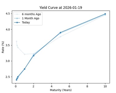 Python was used to automate the extraction and visualisation of RBNZ wholesale interest rate (B2) data, comparing the yield curve at the current date with one-month and six-month historical snapshots.