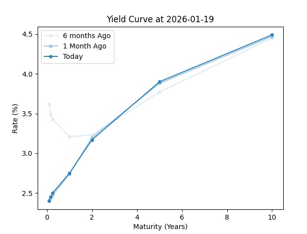 The yield curve plots yields for 30, 60, and 90 day bank bills, along with 1, 2, 5, and 10 year secondary-market government bonds.