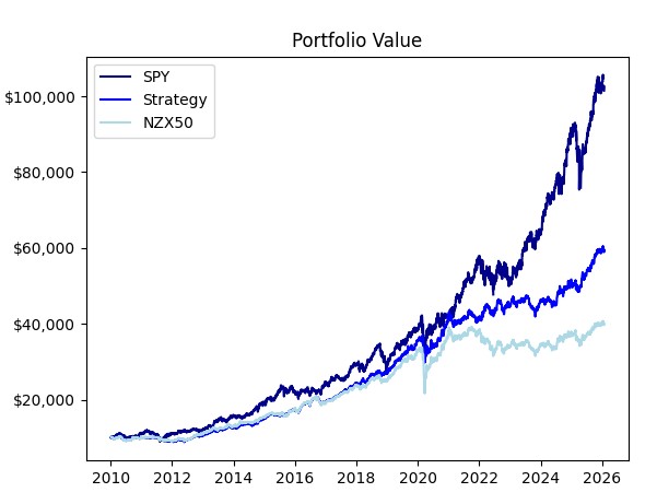 The test date ranged from 2010 to the present day. A transaction cost of 0.1% per trade was included to account for brokerage fees. I also imported the NZD/USD exchange rate so that all performance, including the SPY benchmark, could be compared in NZD on each date.