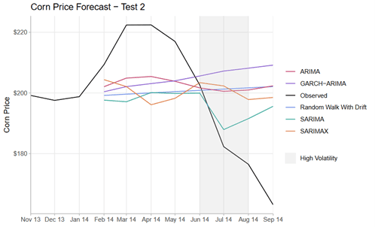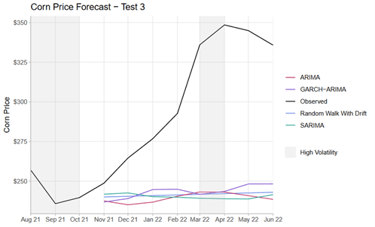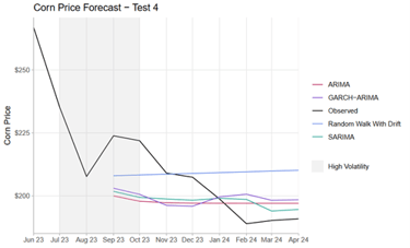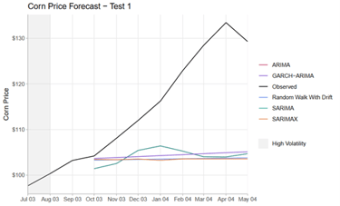 This project analyses how accurately global corn prices can be forecast eight months ahead using a range of time-series models. Using monthly data from 1993–2024, I compared a random walk benchmark against ARIMA, SARIMA, ARIMAX and ARIMA-GARCH models, evaluating performance across multiple rolling out-of-sample tests. The study incorporates production, demand, weather, geopolitical risk and input cost variables to assess whether fundamentals improve forecast accuracy, while also accounting for volatility clustering through GARCH. Results show that seasonal ARIMA models perform best on average, though all models struggle during sharp trend reversals, highlighting the limits of traditional econometric approaches for medium-term commodity price forecasting. The findings provide practical insights into price risk management for corn producers and consumers, and motivate further work using higher-frequency data and machine learning methods