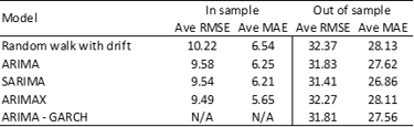 Average mean absolute error (MAE) of the models with forecast horizon (h) of 1 and 4 months.