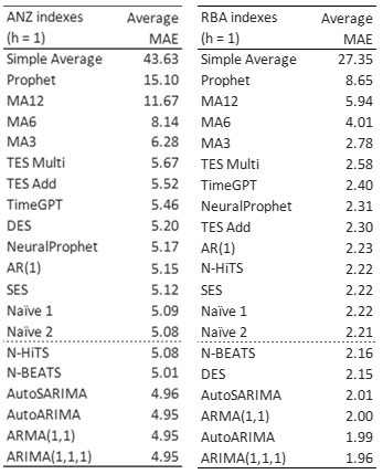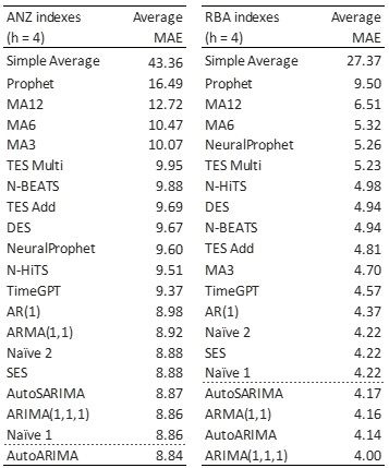 This study compared the performance of traditional forecasting models and machine learning (ML) models on ANZ and RBA commodity price indices over one-month and four-month forecast horizons. The findings indicate that ARIMA variants consistently outperformed naïve benchmarks and delivered the best overall accuracy. In contrast, ML models struggled to consistently outperform the benchmarks, revealing no clear advantage. However, Prophet stood out as the worst-performing ML model, surpassing only the simple average, while NeuralProphet’s improved accuracy over Prophet was confirmed. A key observation was the substantial computational time required by ML models, which did not translate into better forecasting accuracy. These results suggest that analysts forecasting ANZ and RBA commodity prices should prioritize ARIMA models for their robustness and accuracy. For future research, in-depth optimization of ML models is recommended, particularly using Bayesian methods to automate hyperparameter tuning across models and indexes (AWS, 2025). These automated methods test various parameter combinations to identify the optimal settings which would give them a fairer representation in the study. Exploring longer forecast horizons could also yield valuable insights, as accurate long-term predictions are highly beneficial. Additionally, incorporating exogenous variables, such as macroeconomic indicators or weather data, may enhance predictive performance.